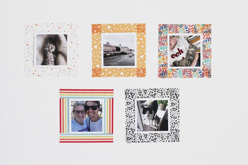 Als je wat verschillende patroontjes hebt, kun je de washitape ook hele leuk combineren zoals in dit voorbeeld. Ik heb de foto’s op de muur geplakt en hier vervolgens met washitape een fotolijstje omheen gemaakt. Het fijne is dat je de washitape gewoon weer heel makkelijk van de muur haalt als je het zat bent. Doe dit natuurlijk wel altijd een beetje voorzichtig, maar in principe hoef je niets te beschadigen.