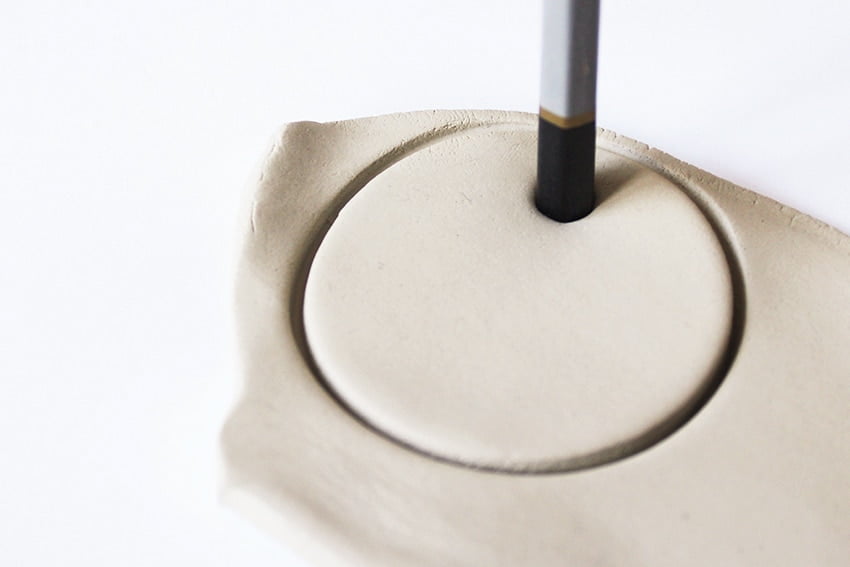 Zet een glas op het uitgerolde klei en snijd dit rond voor de basis van je sleutelhanger. Maak hierin met een potlood, of ander voorwerp een gaatje waar uiteindelijk de sleutelhanger door kan.