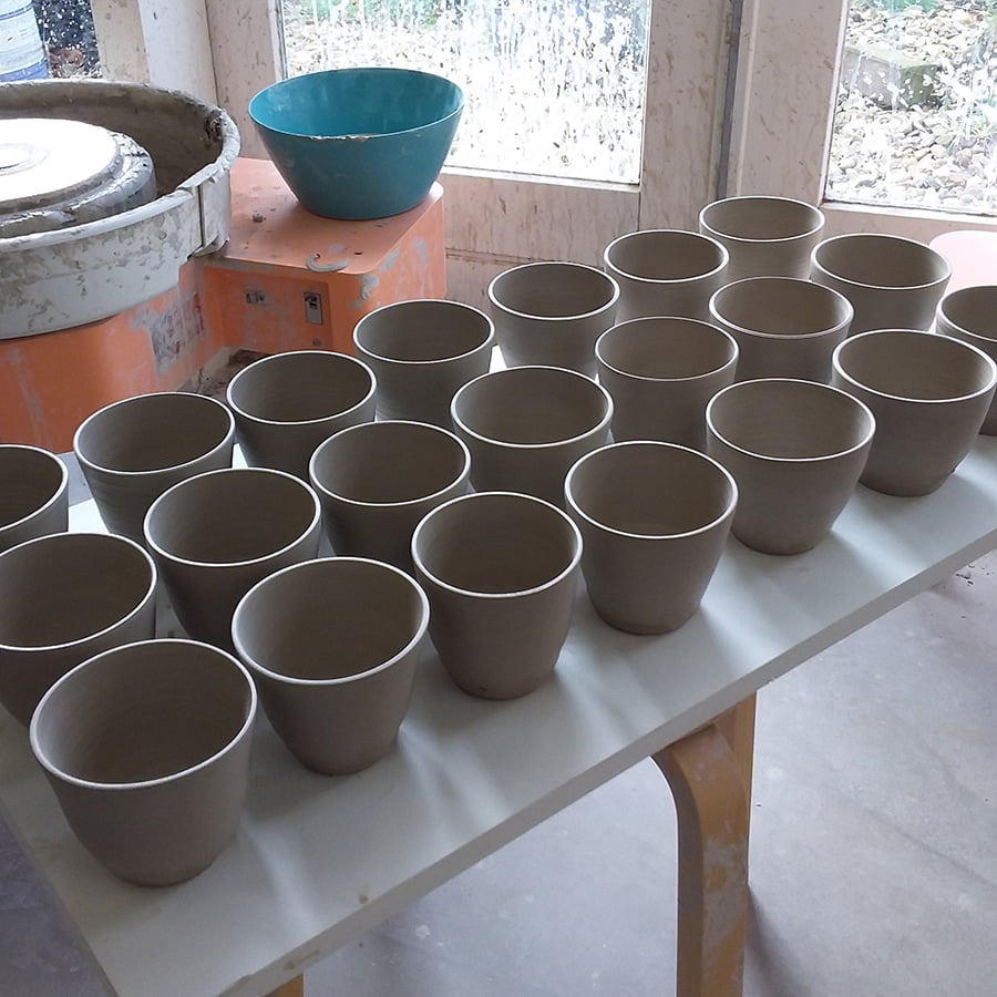 Toen ik alles bepaald had, ging Paul aan de slag. Het maken van mokken is een vrij arbeidsintensief traject. Allereerst draait hij van klei alle mokken in de vorm die ik heb gekozen. Hierbij wordt rekening gehouden met dat de mok goed staat en of hij een fijne drinkrand heeft. Ook zet Paul tijdens dit proces gelijk zijn initialen erin. Er moet rekening gehouden worden dat elk kopje nog iets krimpt dus dat ze iets groter gemaakt worden. Daarna moeten de mokken een week goed drogen voordat ze gebakken kunnen worden.
