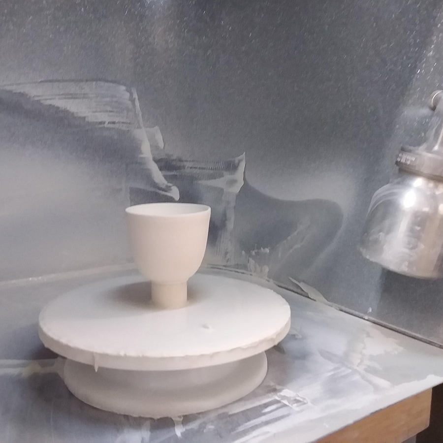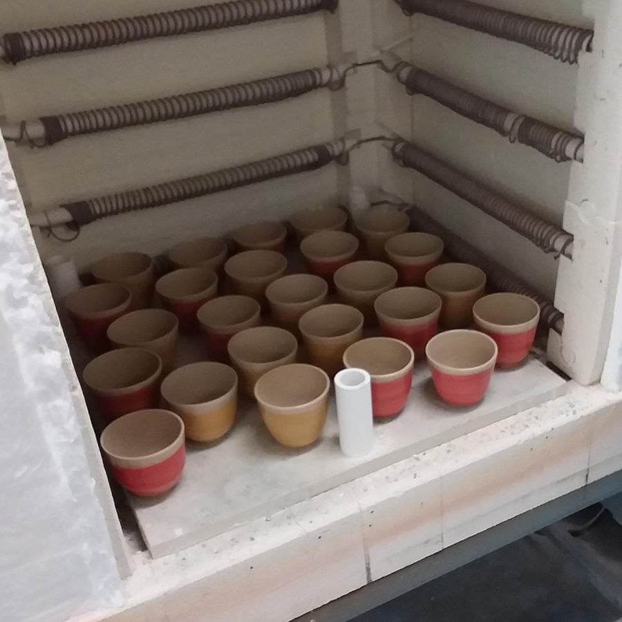 Als de mokken na een week zijn gedroogd, gaan ze de oven in om uit te harden. Ze hebben dan nog steeds geen kleur en zijn ook niet geglazuurd. Het glazuur zorgt voor dat gladde, glimmende en beschermende laagje op de mok, maar dat gebeurt dus in twee fases.
